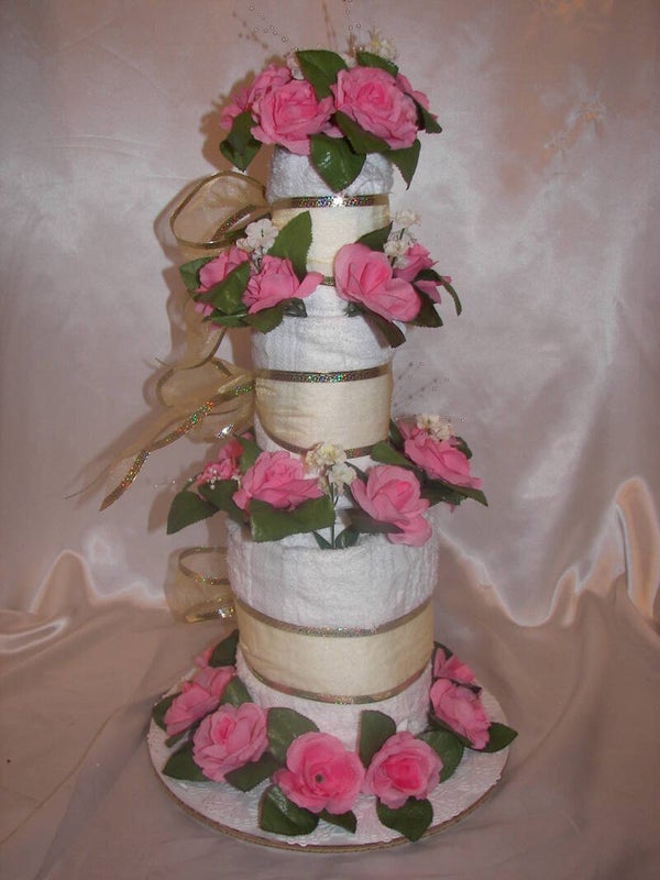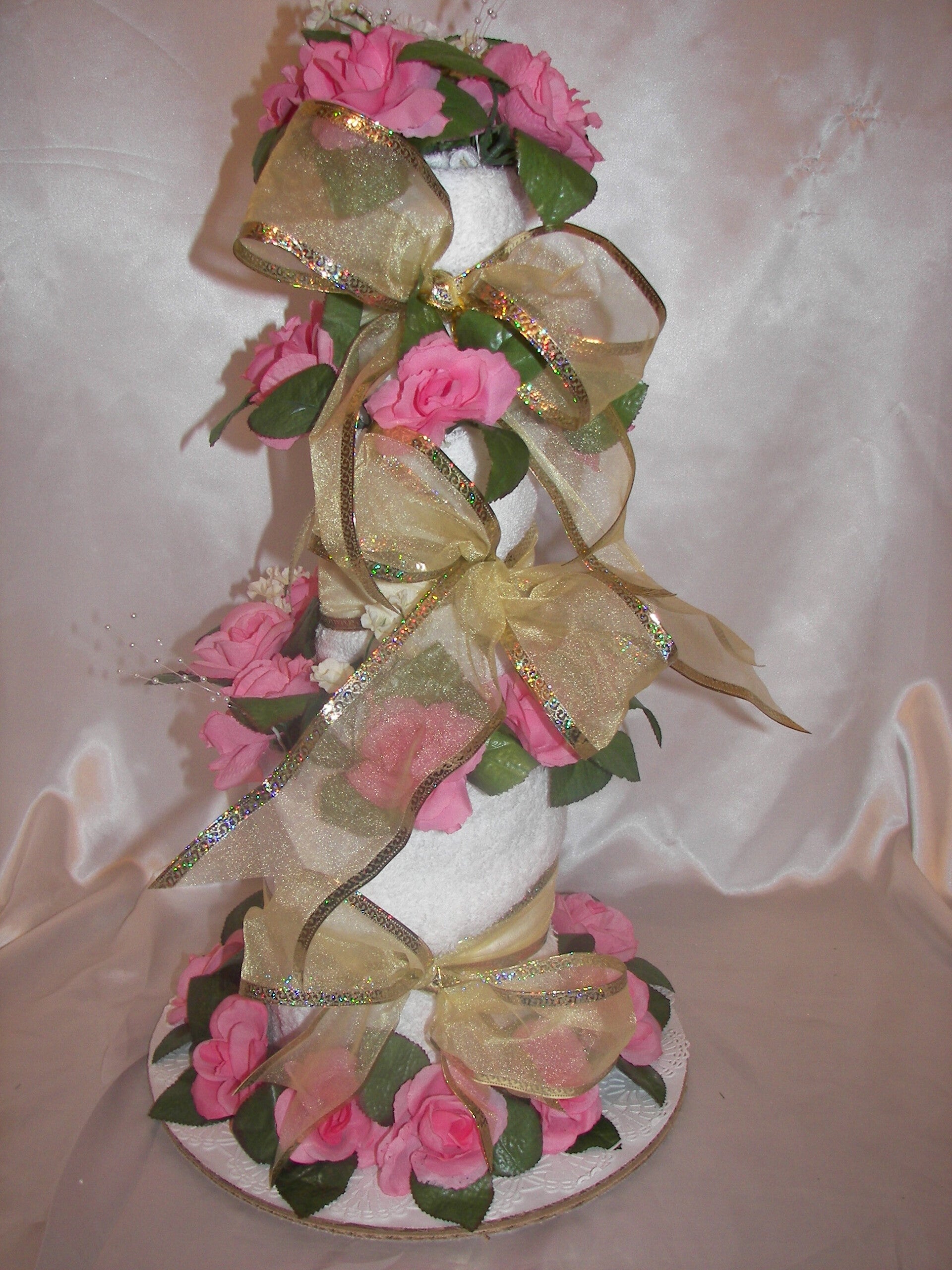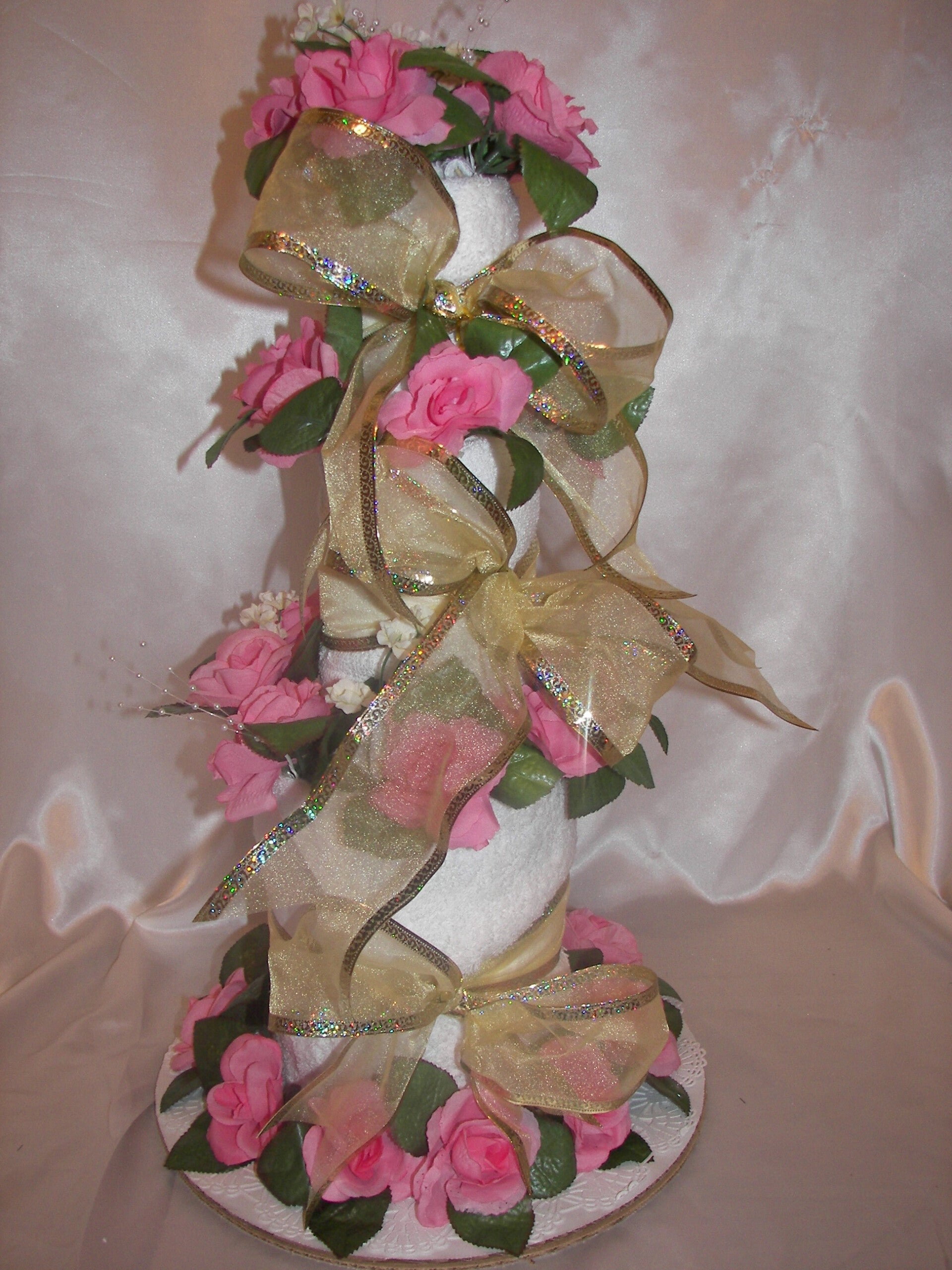 White and Pink Wedding Towel Cake 2 Towels, 2 Hand Towels, 2 Wash Cloths, Flowers, gift card and wrapping