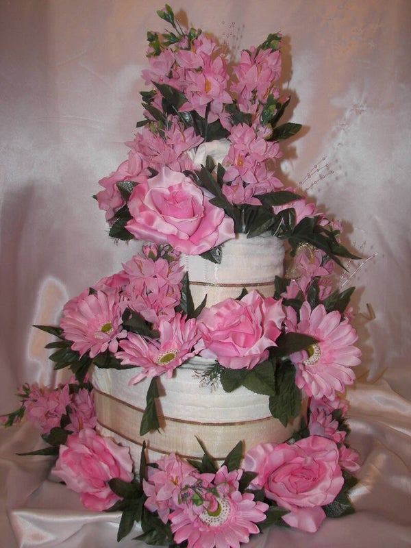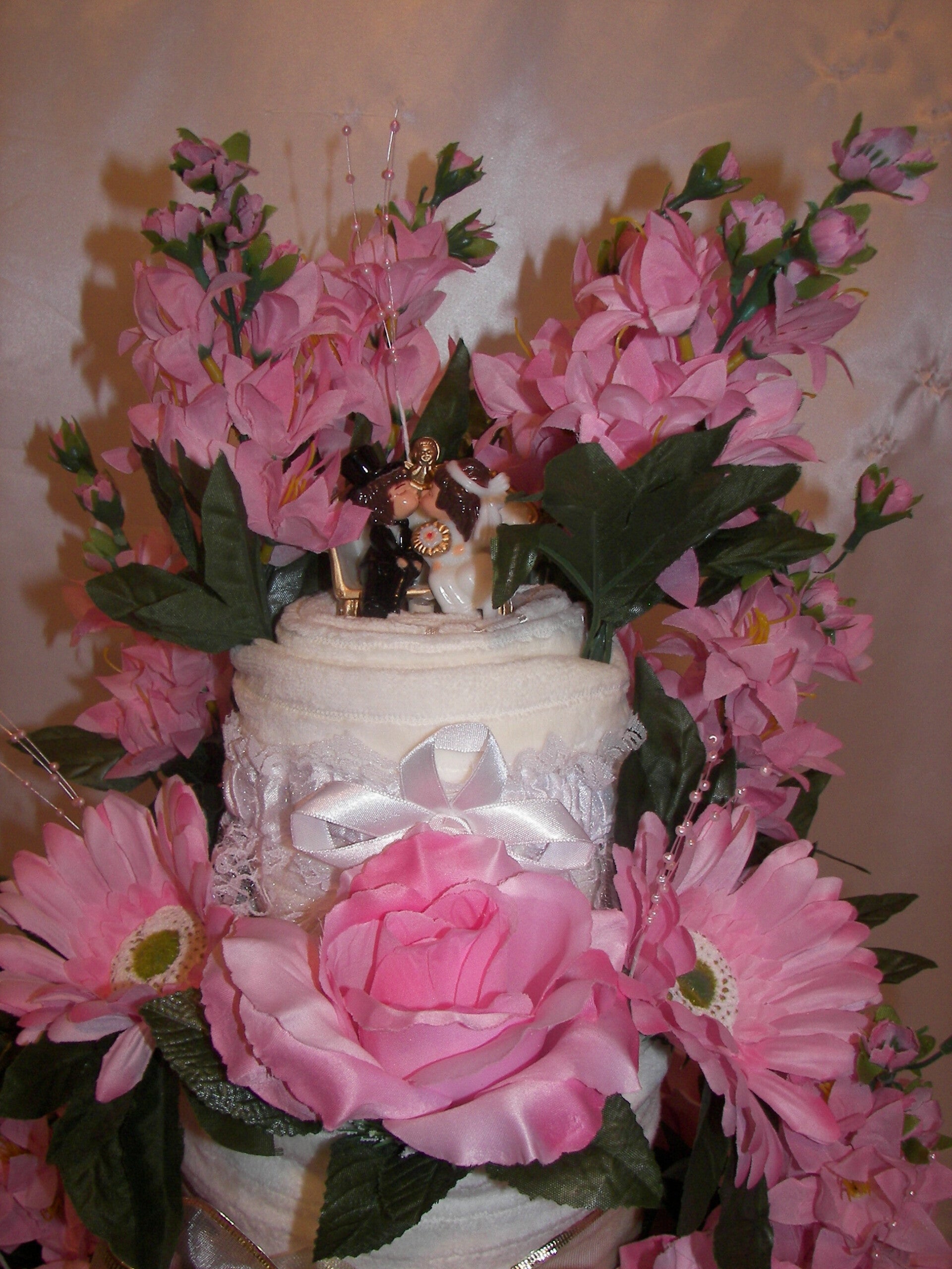 Pink and White Wedding Towel Cake 4 Towels, 4 Hand Towels, 4 Wash Cloths, Collectable Bear, Flowers, gift card and wrapping