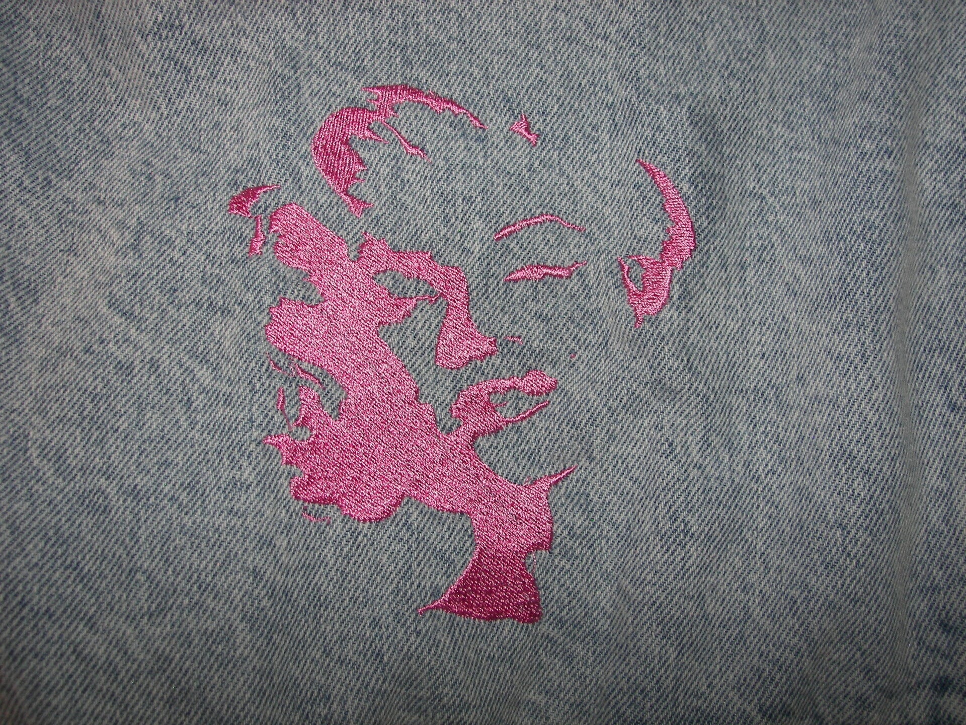 Jean jacket wiith Marilyn Monroe tattoo on back of jean jacket.