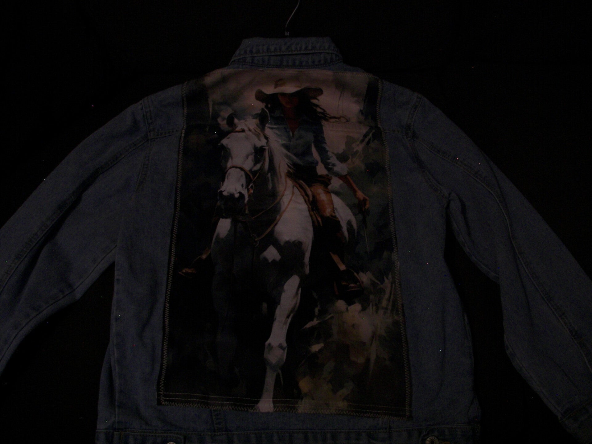 Cowgirl on Horse on back of jean jacket. Size: M